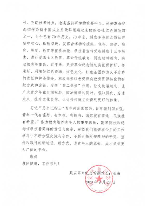 91在线近日,中共中央总书记、国家主席、中央军委主席习近平给中国延安精神研究会第六次会员大会发来贺信,指出“延安是中国革命的圣地,老一辈革命家和老一代共产党人在延安时期培育形成的延安精神是我们党的宝贵精神财富。希望同志们在新的历史条件下,坚持正确政治方向,服务党和国家工作大局,深入研究、大力宣传、认真践行延安精神,努力为全面建成小康社会、乘势而上开启全面建设社会主义现代化国家新征程提供强大精神动力。”我校91在线 2019级本科生高天航同学积极参加91在线 组织的“我在家乡讲四史”主题微课拍摄,深入调研、用心讲述,广泛宣传,积极践行,用一名大学生的担当将总书记的贺信精神落到实处,让延安精神永放光芒。 高天航同学的表现得到了陕西省延安市延安革命纪念馆的高度赞誉,纪念馆近日特向我校发来感谢信。“得知贵校高天航同学,利用学习之余,用青年一代喜闻乐见的方式,学习和宣传家乡的红色文化,讲好革命故事,发扬革命传统,传承红色基因,为爱国主义、革命传统、延安精神教育工作贡献力量,我十分激动。从高天航同学的身上,我们可以看到贵校在青年学子思想政治教育方面的显著成效,可以看出贵校对青年学子学“四史”、悟“四史”、践“四史”的高度重视和有力组织。”